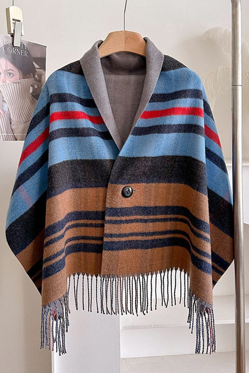 Plaid Fringed Cape (Blue)