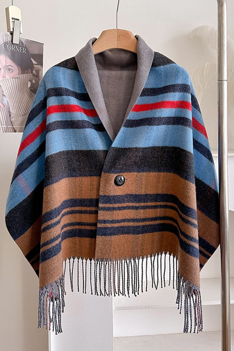 Elevate your look with this ultra chic (reversible) wool blend cape style shawl.  This cape features modern fringe detailing, an overisezed button, and a timeless tailored silhouette.  This piece is perfect for layering and transitioning from day to night.