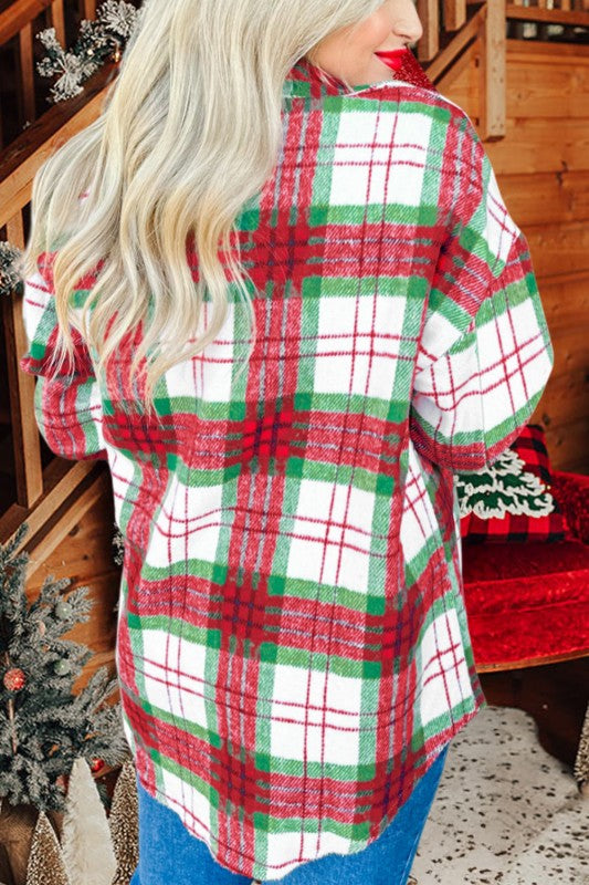 Turn heads in our chic and fuzzy Christmas plaid Shacket.  Crafted from a soft, comfortable fabric, it’s perfect for layering on crisp days or a stylish twist to your everyday look.